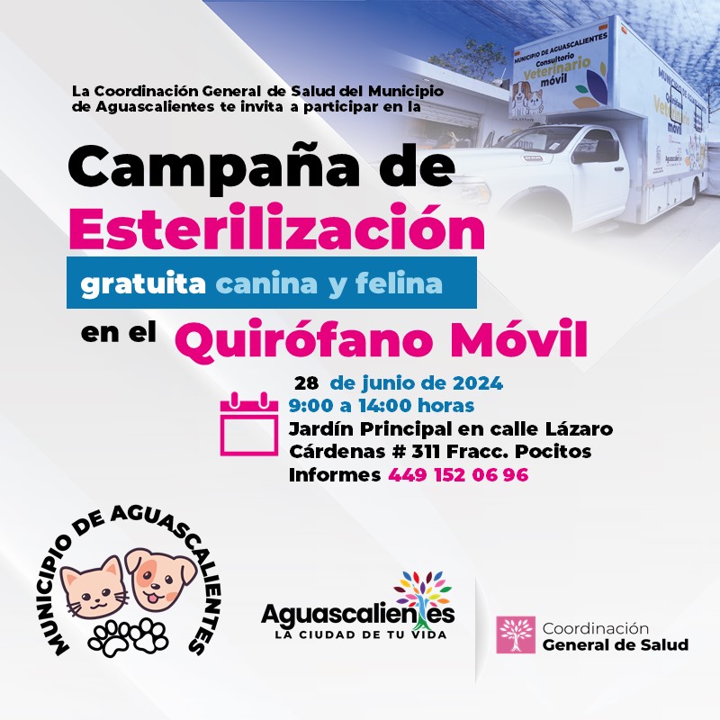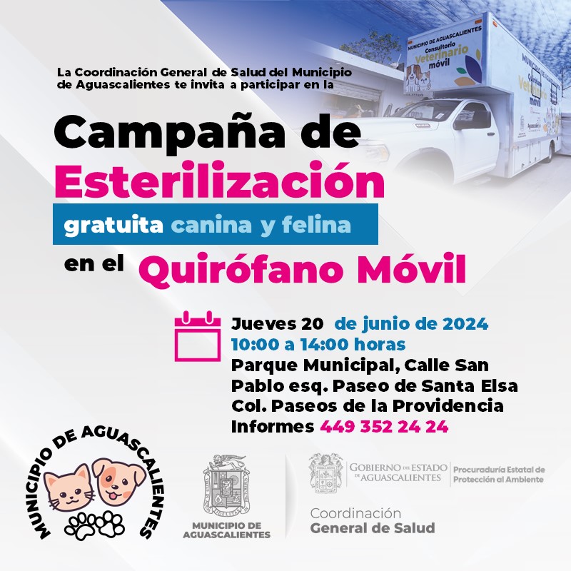 La titular de la Coordinación General de Salud del Municipio de Aguascalientes, Dulce Andrade Lovera, dio a conocer que se efectuarán las últimas jornadas de esterilización gratuita canina y felina del mes de junio del Quirófano Veterinario Móvil.