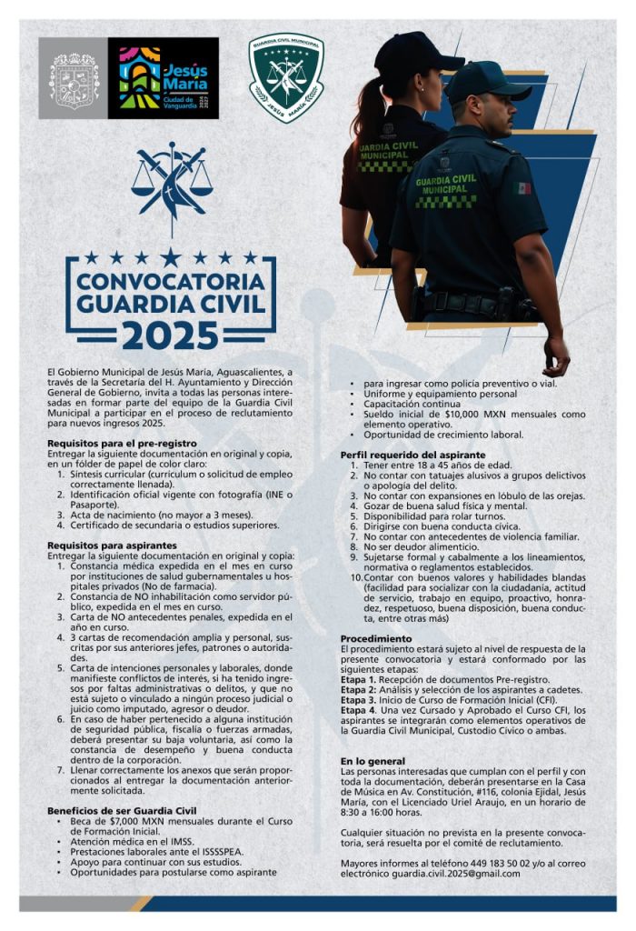 En este sentido el Gobierno Municipal de Jesús María invita a hombres y mujeres que tengan la secundaria concluida, disponibilidad de rolar turnos, que gocen de buena salud física y mental que estén interesados en formar parte de la Guardia Civil a consultar las bases y requisitos, tomando en cuenta que recibirán una sueldo inicial de 10 mil pesos al mes, oportunidades de crecimiento, así como una beca de 7 mil pesos durante su preparación.